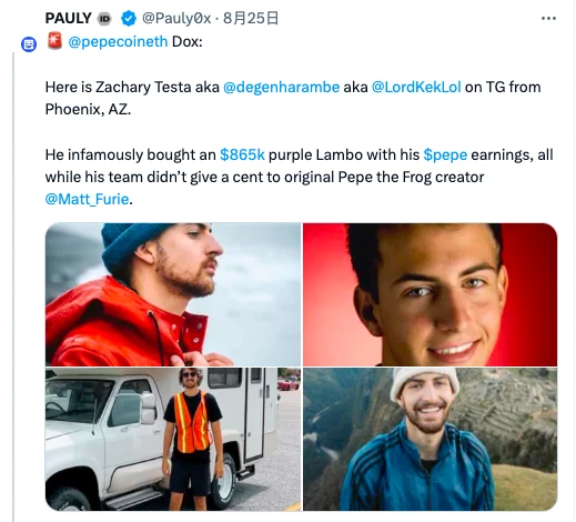 他表示,PEPE 创始人的真实身份为现居亚利桑那州的 Zachary Testa。Zachary 常用 z(@degenharambe)和 Lord Kek(@LordKekLol)这两个账号在社交媒体上活动。Zachary Testa 生于 1997 年, 2018 年毕业于亚利桑那州立大学,现为一名职业摄影师。
