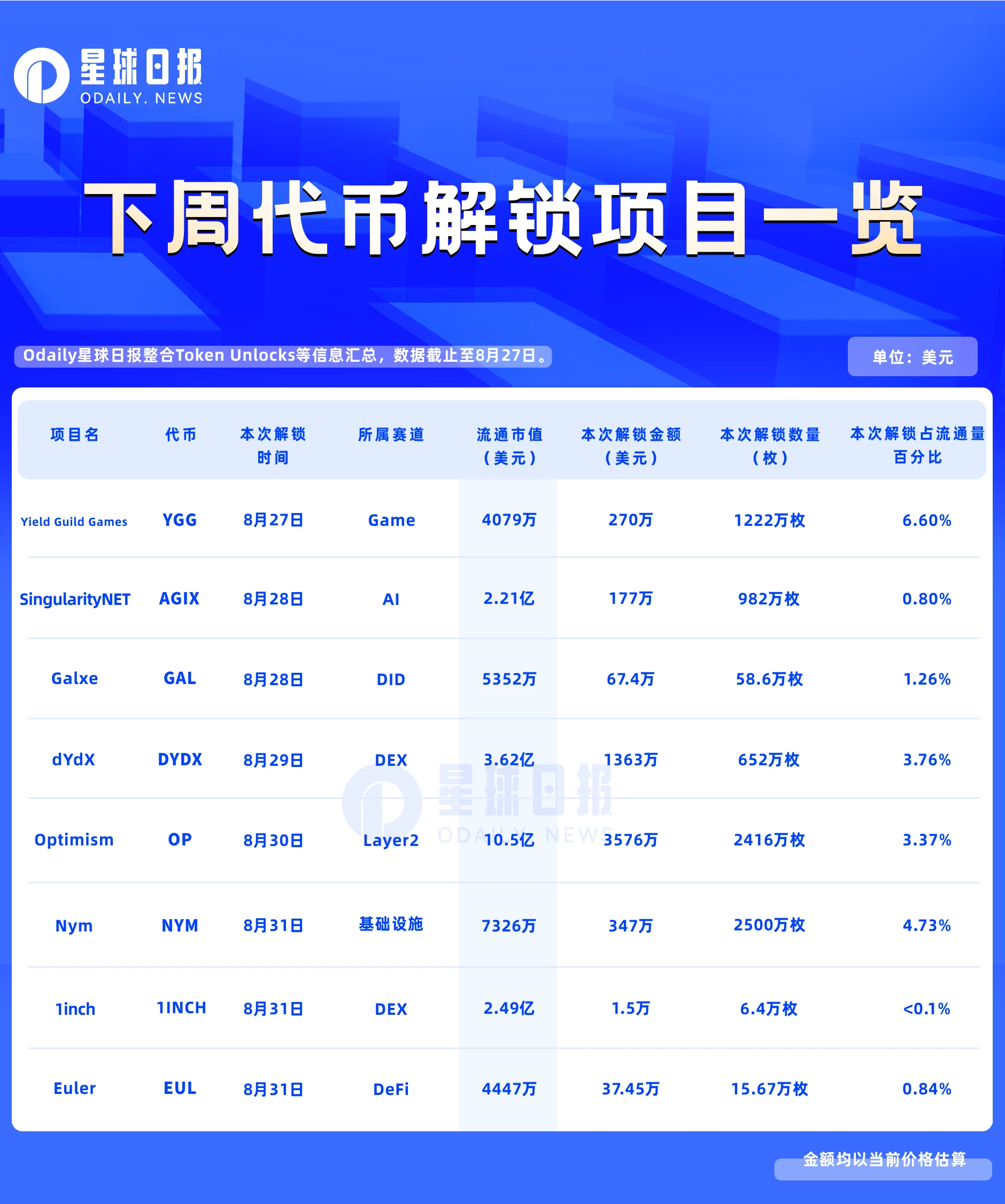本周,YGG 代币将解锁约 1222 万枚,约合 270 万美元。目前 YGG 流通数量仅 1.85 亿枚,本次解锁数量约为流通量的 6.6% ,解锁数量颇丰,请投资者留意捕捉市场机会。