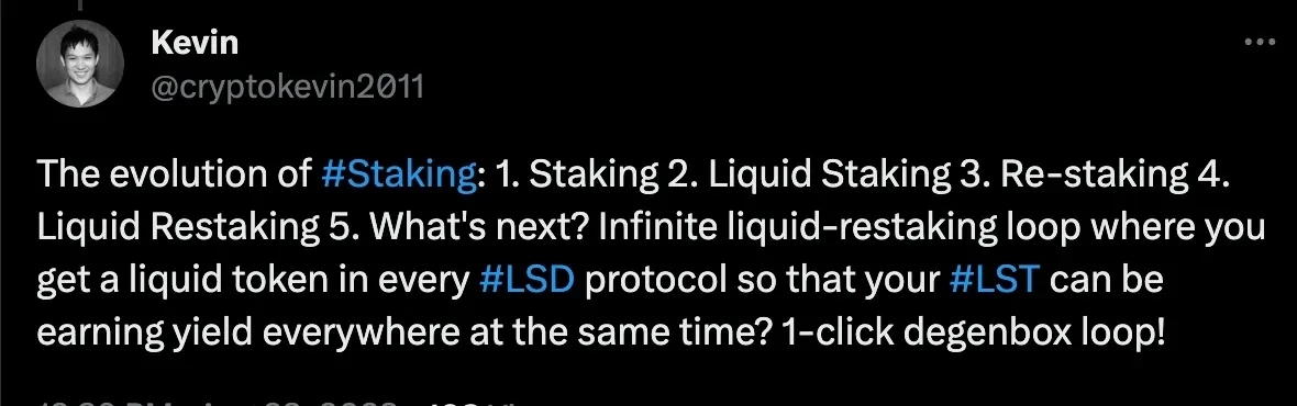 EigenLayer 正处于这一叙事的前沿。 简单来说,以太坊的安全性可以通过允许以太坊持有者「再质押」他们的 ETH 来同时保护多个网络。然而,这带来了更高的风险,为了补偿,再质押的持有者可以获得更高的回报,即获得一种新的山寨币,它承诺将改变我们生活的世界。