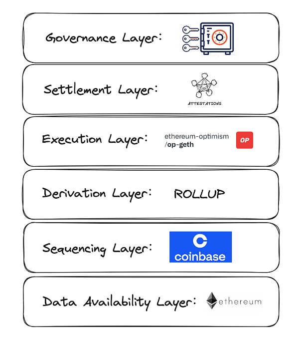 Base是基于 OP Stack Bedrock版本构建的 Layer2 网络。由于Bedrock是模块化的网络架构,分为六层,Base的架构也是如此,只是与Optimism略有区别: