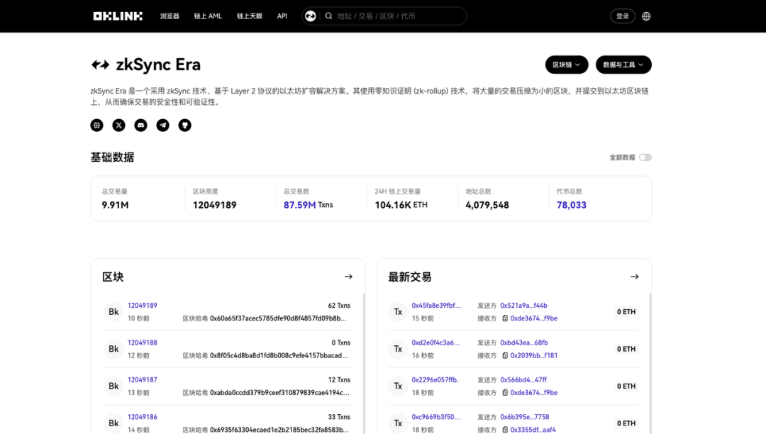 其中,zkSync由是Matter Labs在2018年推出的一款 Layer2 扩容方案,通过采用基于零知识证明的Rollup提升以太坊网络的可拓展性。今年2月,zkSync宣布zkSync Era主网正式上线,欧科云链OKLink多链浏览器随后率先接入zkSync主网数据,成为全网首个支持zkSync网络的多链浏览器。