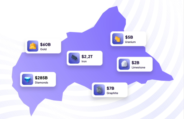 Sango 网站显示,中非共和国估计拥有价值 2.2 万亿美元的铁矿、价值 2580 亿美元的钻石矿、价值 600 亿美元的黄金矿、价值 70 亿美元的石墨矿、价值 50 亿美元的铀矿和价值 20 亿美元的石灰石矿。