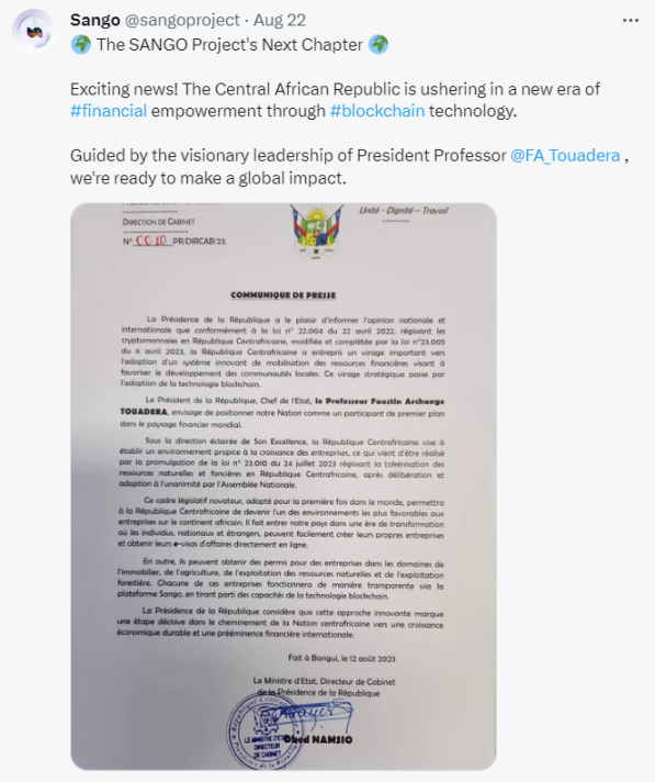 2023 年 8 月,中非共和国(Central African Republic , CAR)的国家数字货币项目 Sango 团队表示,该国立法机构已通过《代币化法案》(Tokenization Law),未来关于土地和自然资源代币化操作将无法律障碍。
