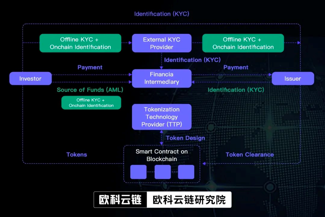 以证券型代币为例,在发行阶段,虚拟资产交易平台、经销商、经纪人等要求交易方提供KYC是属于链下信息收集用于客户身份识别。这一步骤是传统金融合规中的常规措施,当投资者提供了链上的账户地址(钱包)以及用他的链上资产进行交易时,KYC还应延续到链上识别,由下图可以看出客户身份的全面识别贯穿全程。