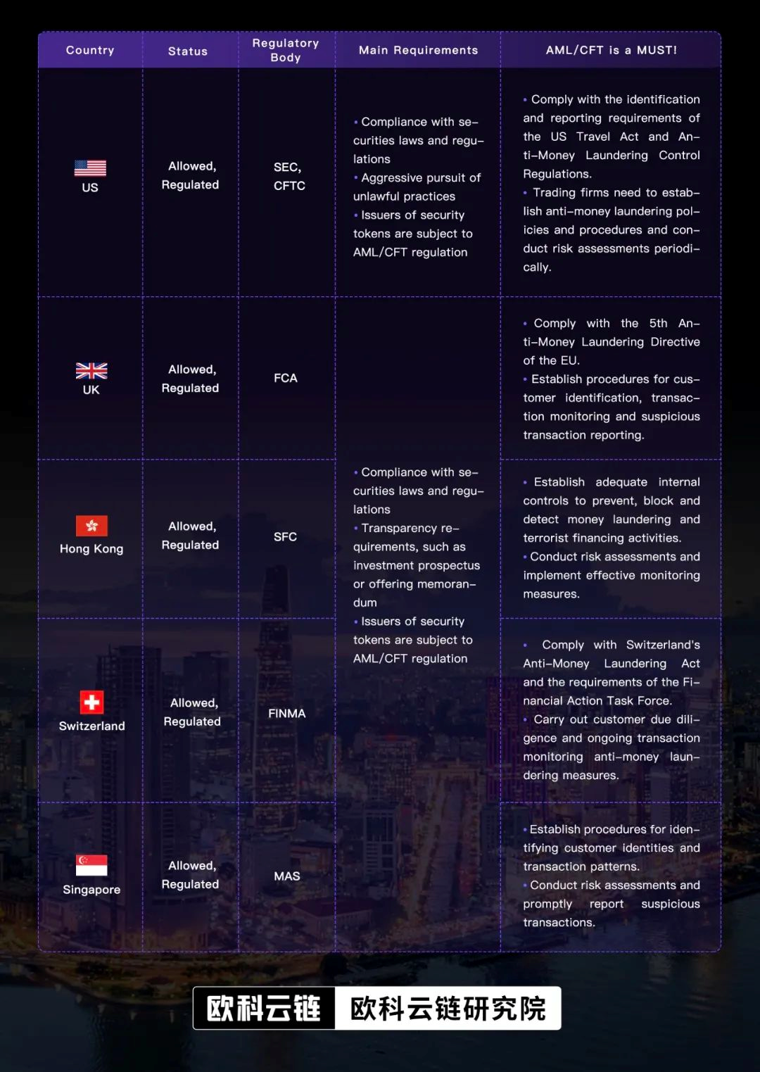 将传统金融工具与区块链技术相结合,是全球金融业的永恒话题。同时这对监管机构的技术监管能力方面,监管机构提出了新要求,但这并不影响全球对证券化代币的监管出台,为其定位。除了香港SFC外,欧科云链研究院对全球主要国家对证券代币化的监管现状进行了整理,详见下表。
