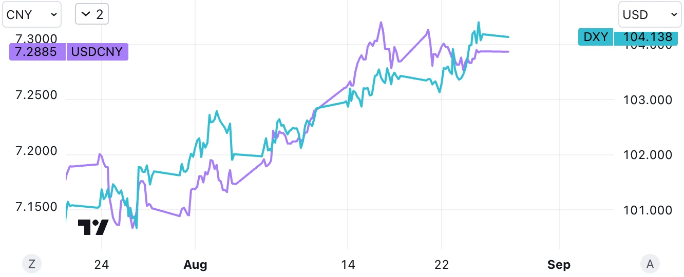 在鲍威尔讲话时,美元指数录得盘中低点 103.75 。他的讲话一结束,美元指数就反弹至 6 月 1 日以来新高 104.45 ;但人民币上周企稳,周五收于 7.288 未能跌破 7.3 重要关口。