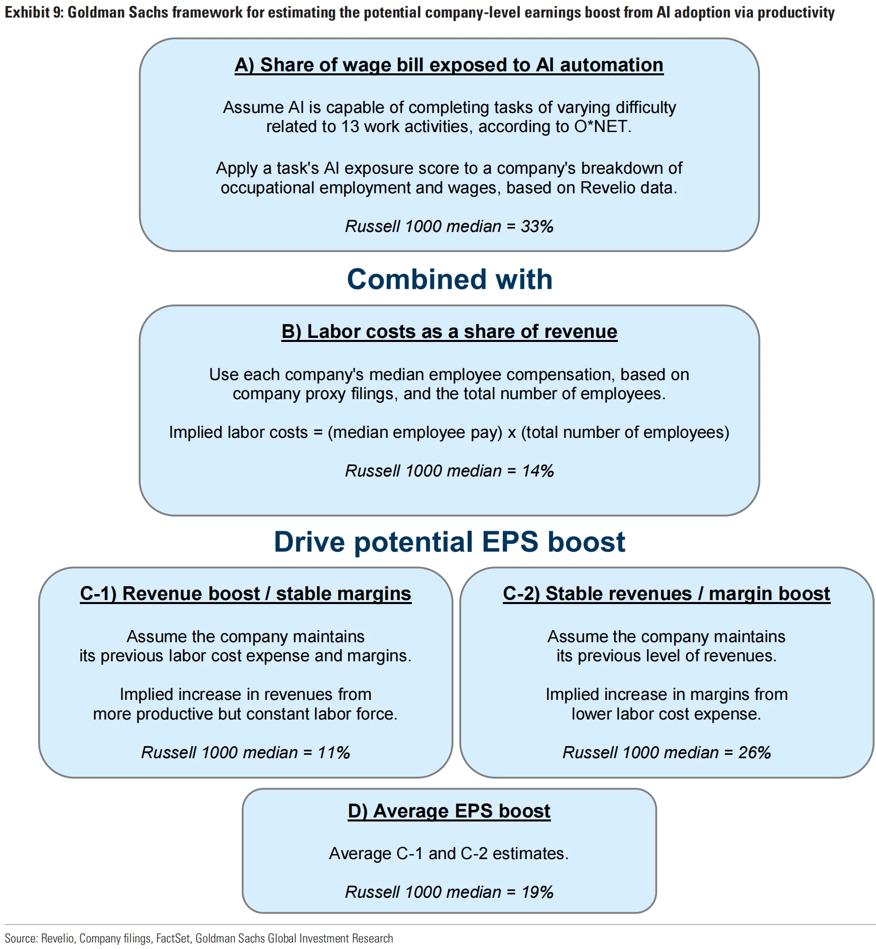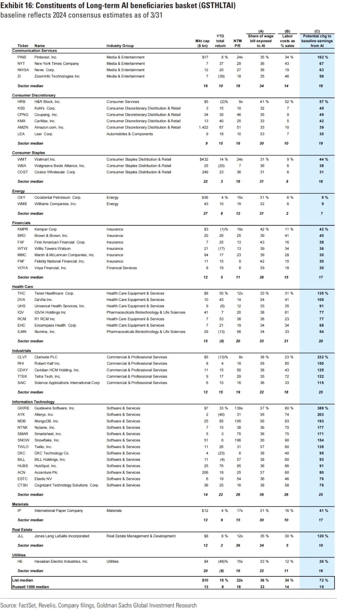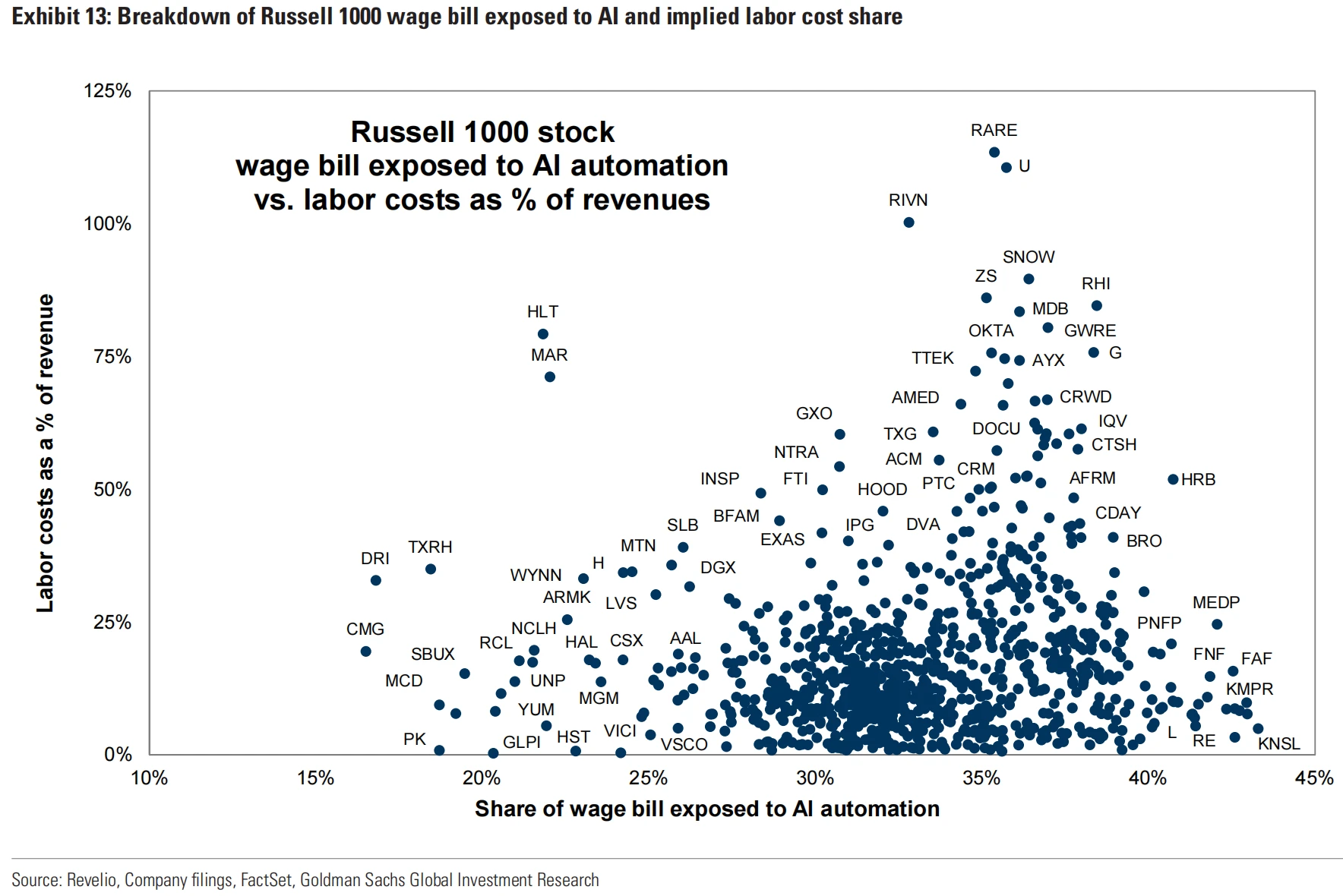 高盛经济学家计算了 1000 家公司工资账单中面临 AI 自动化的份额。他们使用 ONET 数据库中美国 900 多个职业的任务内容数据,根据职业估计面临节约劳动的自动化的总工作量,并假设 AI 能够完成难度最高为 4 的 ONET“等级”量表中的任务。