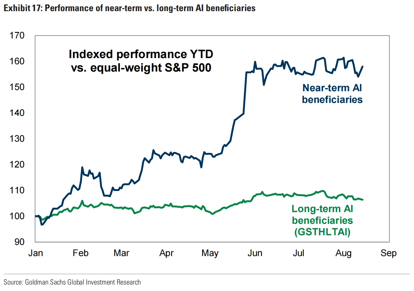高盛选出来的这个篮子里的股票预期在广泛采用人工智能之后,EPS 中位数可能比市场预期高 72% 。该篮子股票今å年表现仅比标准普尔 500 高出 6 个百分点,远低于那些短期受益股票,,表明大多数潜在的生产力提升尚未被定价。这逻辑下利润率的提升可能不会是永久性的,但投资者可能会对这种可能性进行炒作。