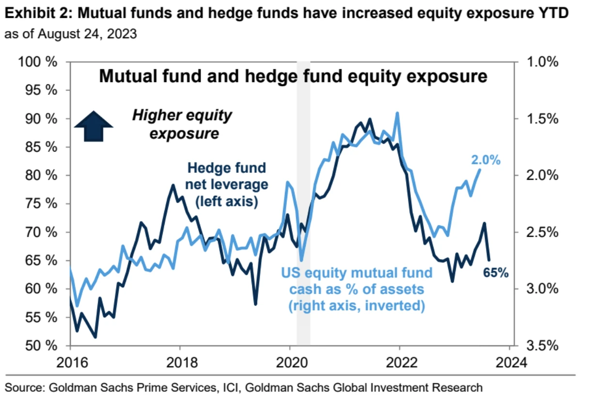 美股对冲基金净杠杆二季度时曾升至 70% 高点,但上周已下降至 65% ,低于过去五年历史数据中的 50 百分位,代表目前对冲基金仓位不算高,有加仓空间: