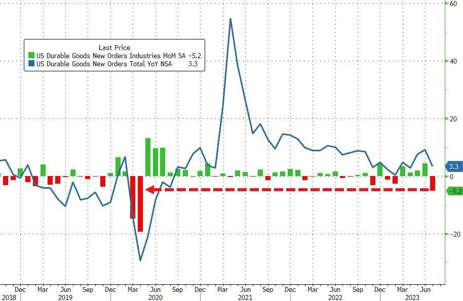 美国 7 月耐用品订单环比初值下降 5.2% ,创疫情以来最大跌幅,主要由于由于非国防飞机订单在前月飙升后大幅下跌近 44% 。