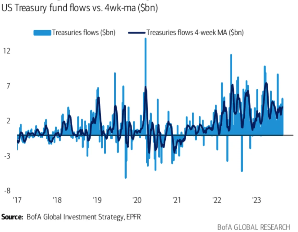 美债基金连续 28 周净流入(+ 52 亿美元),创下自 2010 年以来最长的连续流入纪录: