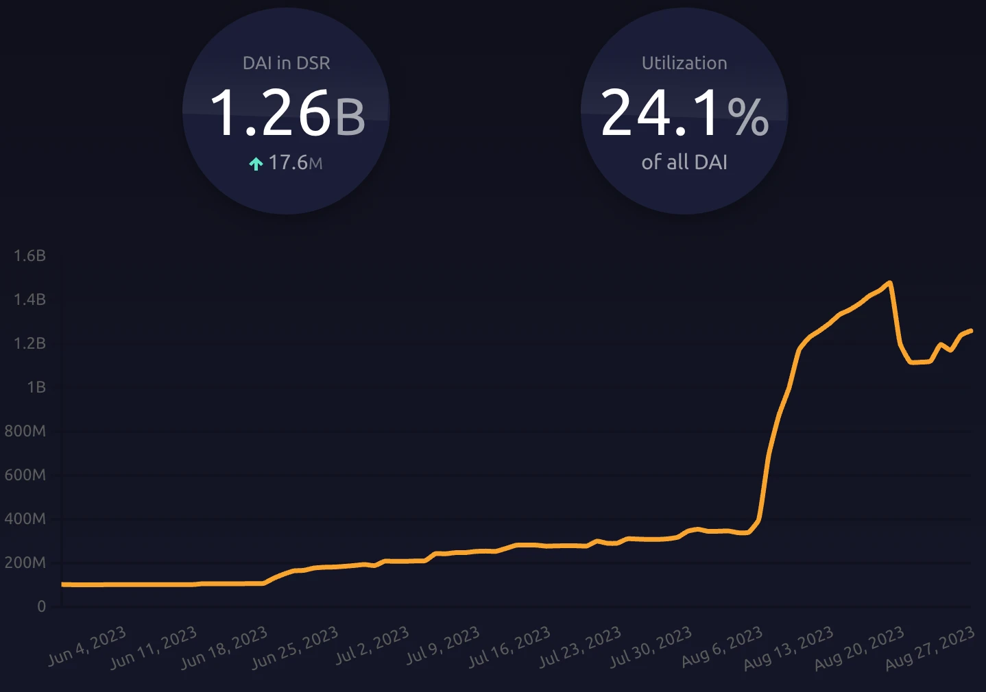 MakerDao 系统的理财池过去一个月锁定了 12.6 亿 DAI,对应 24% 的 DAI 被锁定,所以 DAI 的增长几乎都是因为理财池的原因: