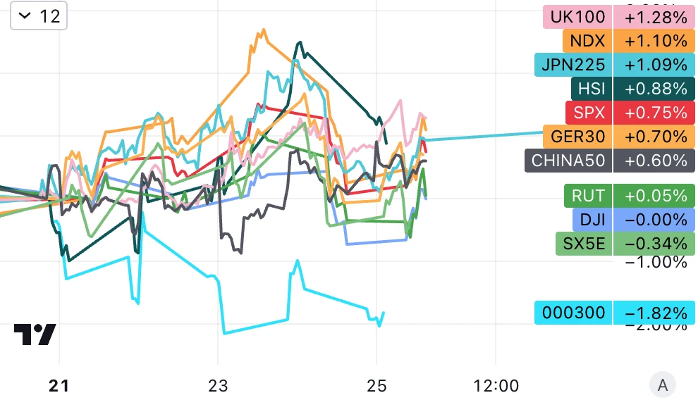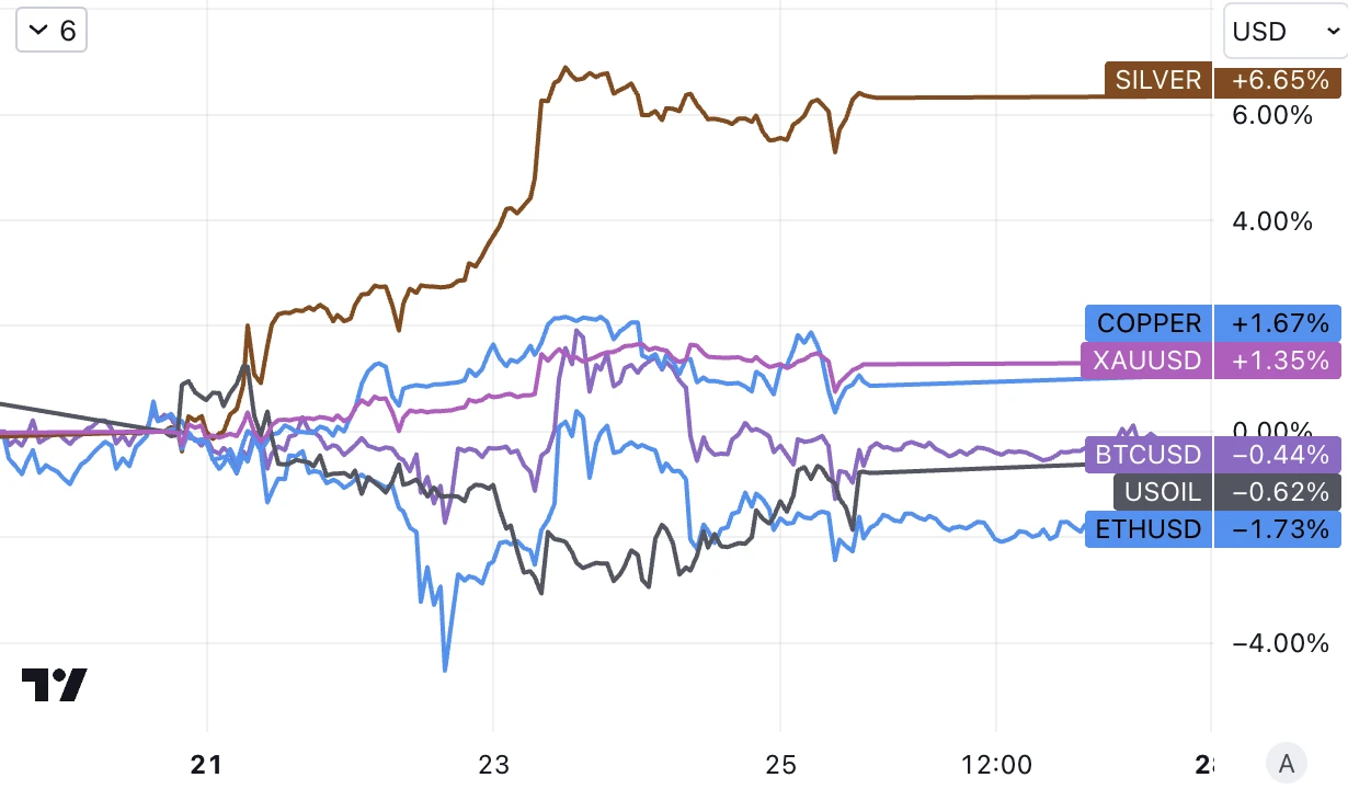 原油小幅收跌,金银铜全线收涨,加密货币小幅下跌。黄金创 7 月中旬以来最佳单周表现,鲍威尔在杰克逊霍尔演讲之前,美国长期债券收益率回落,为金价提供了支撑。
