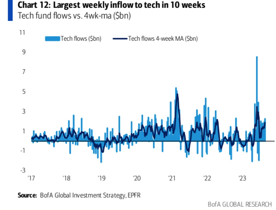 但科技行业基金上周创下 10 周来最大净流入: