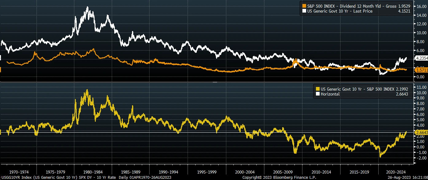 S&P 500 当前的股息率大约为 1.58% ,而 10 年期债券利率大约为 4.25% 。这两者之间的差距是 2.66% ,这是自 2007 年以来最大的差距。