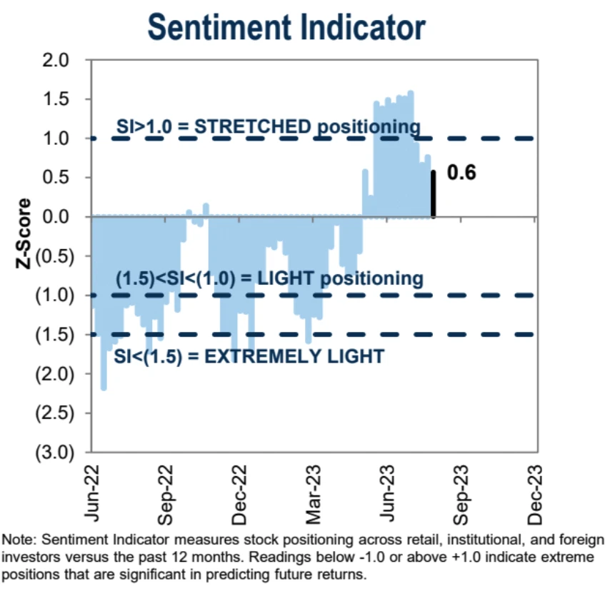 高盛的美股情绪指标从前周的 0.8 降至上周的 0.6 ,仍位于中性区间: