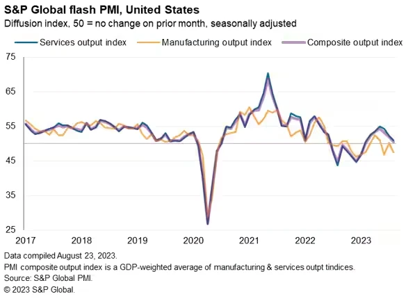 美国 8 月 Markit 制造业 PMI 初值 47 ,创今年 2 月份以来新低;服务业 PMI 初值 51 ,创两个月新低;综合 PMI 初值 50.4 ,创今年 2 月以来新低。分析称,消费者需求疲软, 8 月份的商业活动几近停滞,引发了人们对美国第三季度经济增长力度的怀疑。