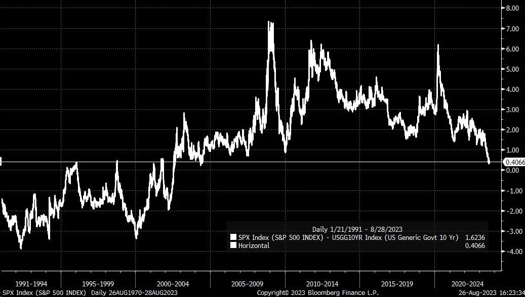 S&P 500 当前的盈利率与 10 年期债券利率之间的差距仅为 40 个基点, 2004 年以来最小的差距。