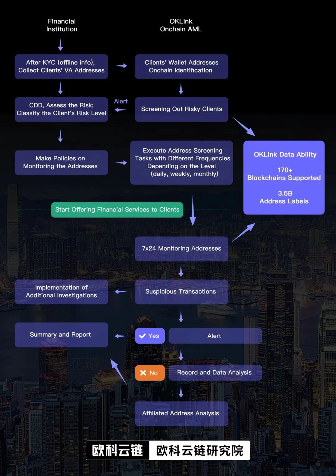 这与传统的证券不同,证券是中心化结构为主,机构间交易的合规依托机构层层 KYC 来确保。对于金融机构最有效的做法就是采用例如欧科云链 OKLink 、 Chainalysis 、 Elliptic 等链上合规工具追踪客户在链上的虚拟资产动向,从而进行全过程监管与全链条跟踪,旨在防范账户(链上地址)与真实身份脱节的洗钱行为。