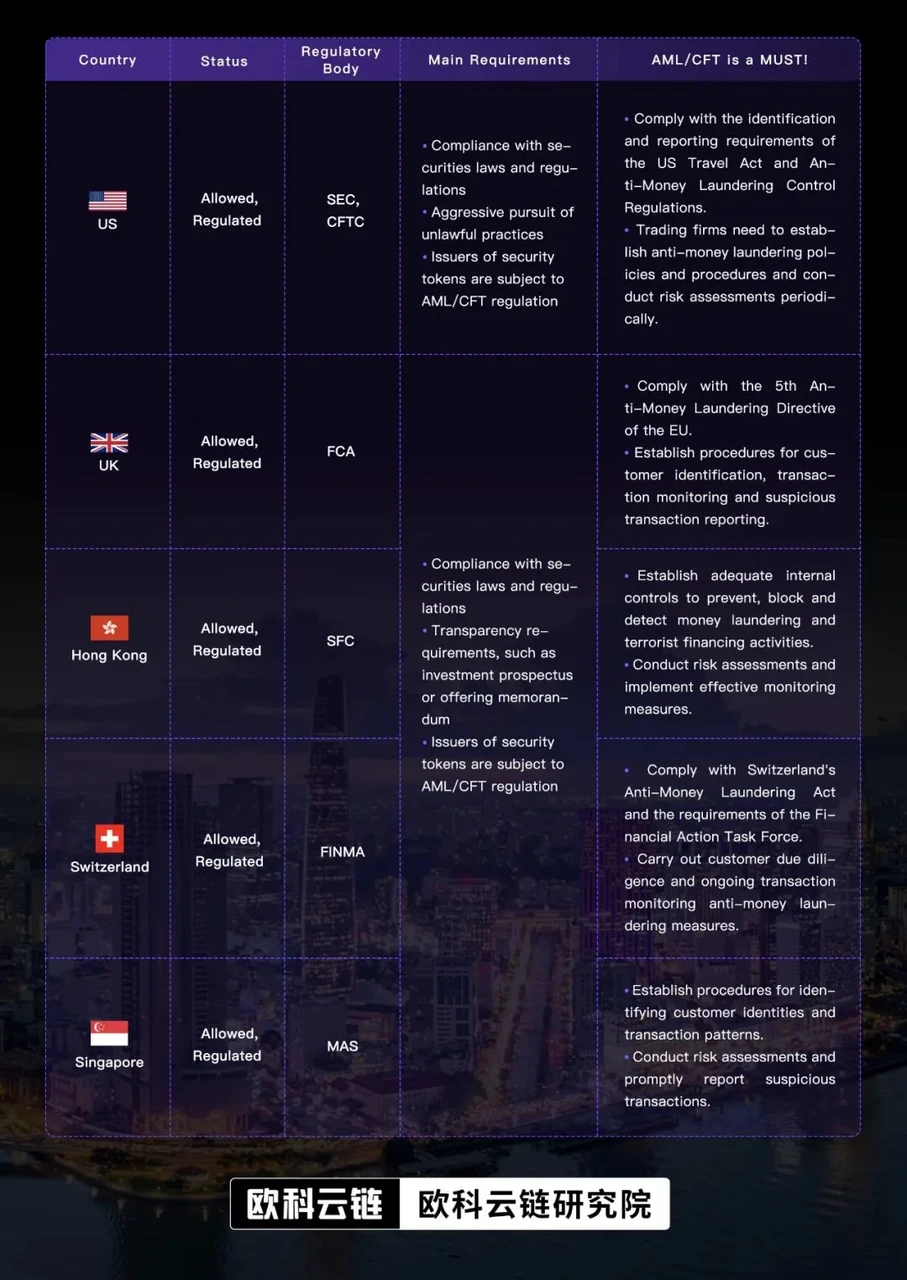 将传统金融工具与区块链技术相结合,是全球金融业的永恒话题。同时这对监管机构的技术监管能力方面,监管机构提出了新要求,但这并不影响全球对证券化代币的监管出台,为其定位。除了香港 SFC 外,欧科云链研究院对全球主要国家对证券代币化的监管现状进行了整理,详见下表。