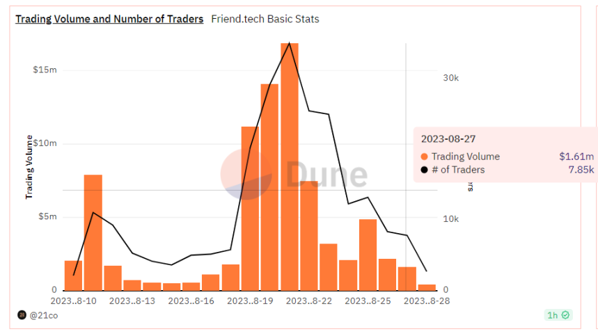 根据 Dune Analytics 的数据,Friend.Tech 的日交易量自 8 月 21 日达到 1690 万美元的峰值以来已下跌 90.4% , 8 月 27 日的日交易量已降至仅 161 万美元。 此外,每日交易者数量从高峰期的 3.5 万人下降到 8 月 27 日的仅 7850 人,下降了约 77.57% 。