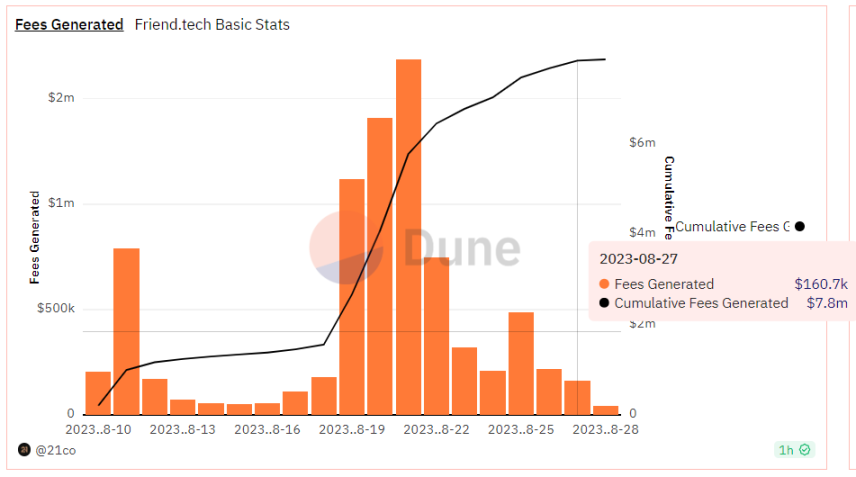 Friend.Tech 的网络费用也从 8 月 21 日的 170 万美元降至 8 月 27 日的 16 万美元。
