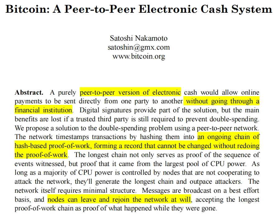 《Bitcoin: A Peer-to-Peer Electronic Cash System》提出了一种去中心化点对点电子现金支付系统的设想,即电子现金可以基于区块链技术,采用分布式账本,通过非对称加密技术进行数字签名,并结合共识机制实现去中心化的点对点(P2P)交易。比特币白皮书,通过结合多种创新科技和对社会生产关系的变革设计,希冀改变以传统银行为核心的中心化金融系统,实现整个金融网络系统的去中心化。