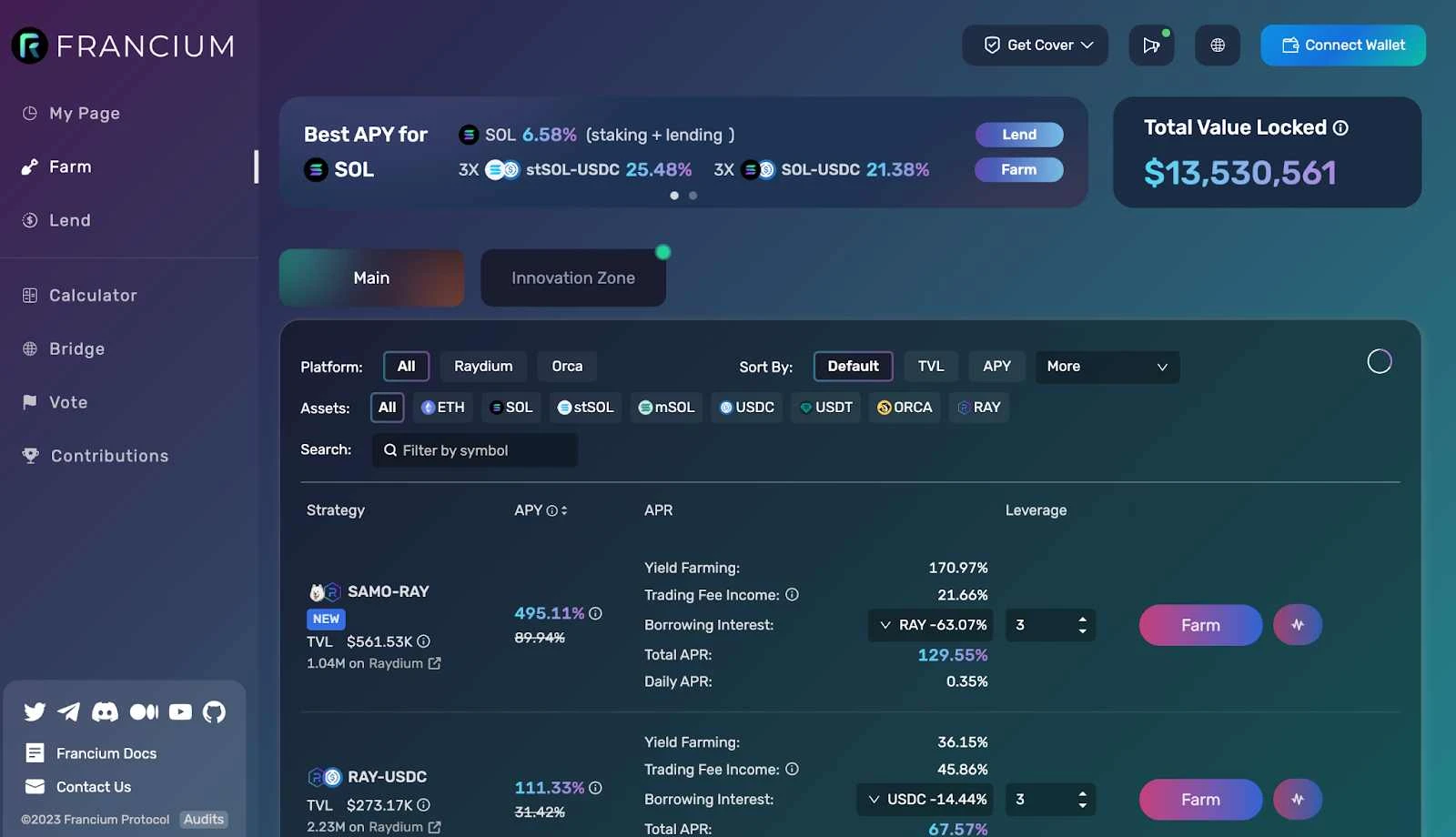 Francium 是一个非常不错的产品,在上一个周期的高峰时期达到了超过 4.25 亿美元的总锁仓价值。协议提供了借贷产品,同时还提供在特定单边资产以及 LP 资产对上进行杠杆收益农场的机会。这些新产品在 Solana 上推出将提供一些很棒的赚钱机会。