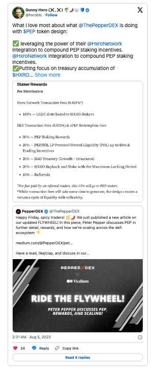 Pepper DEX 是建立在 Hxro Network 之上的永续合约和到期期货去中心化交易平台,受益于 PEP 和 HXRO 质押者的代币循环机制。Solana 首次引入期权代币,如 oPEP,其代币设计看似非常周全,这是给农民和 DeFi 狂热者们的选择。