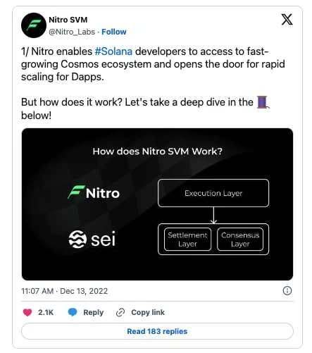 Network 最近发布了关于 Nitro 如何支持基于 Cosmos 的应用程序以及 Solana 的执行时间、吞吐量和费用的优势的公告。