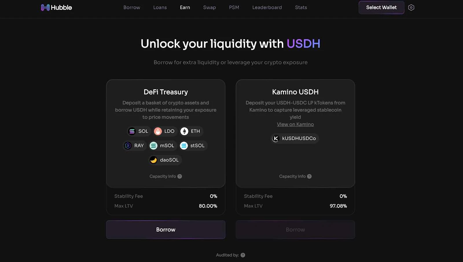 的 CDP 协议,用户可以存入各种资产并铸造他们的 USDH 稳定币产品。Hubble 有一个由 Kamino 管理的活跃的 USDC-USDH LP 池。