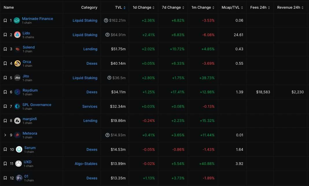 Marinade Finance 是 Solana 上排名第一的 DeFi 应用,其总锁定价值超过 1.62 亿美元。他的 mSOL 产品经受住了时间的考验,并在多个场合得以实施。就像以太坊上的 stSOL 一样,mSOL 可以存入到上述的许多协议中。