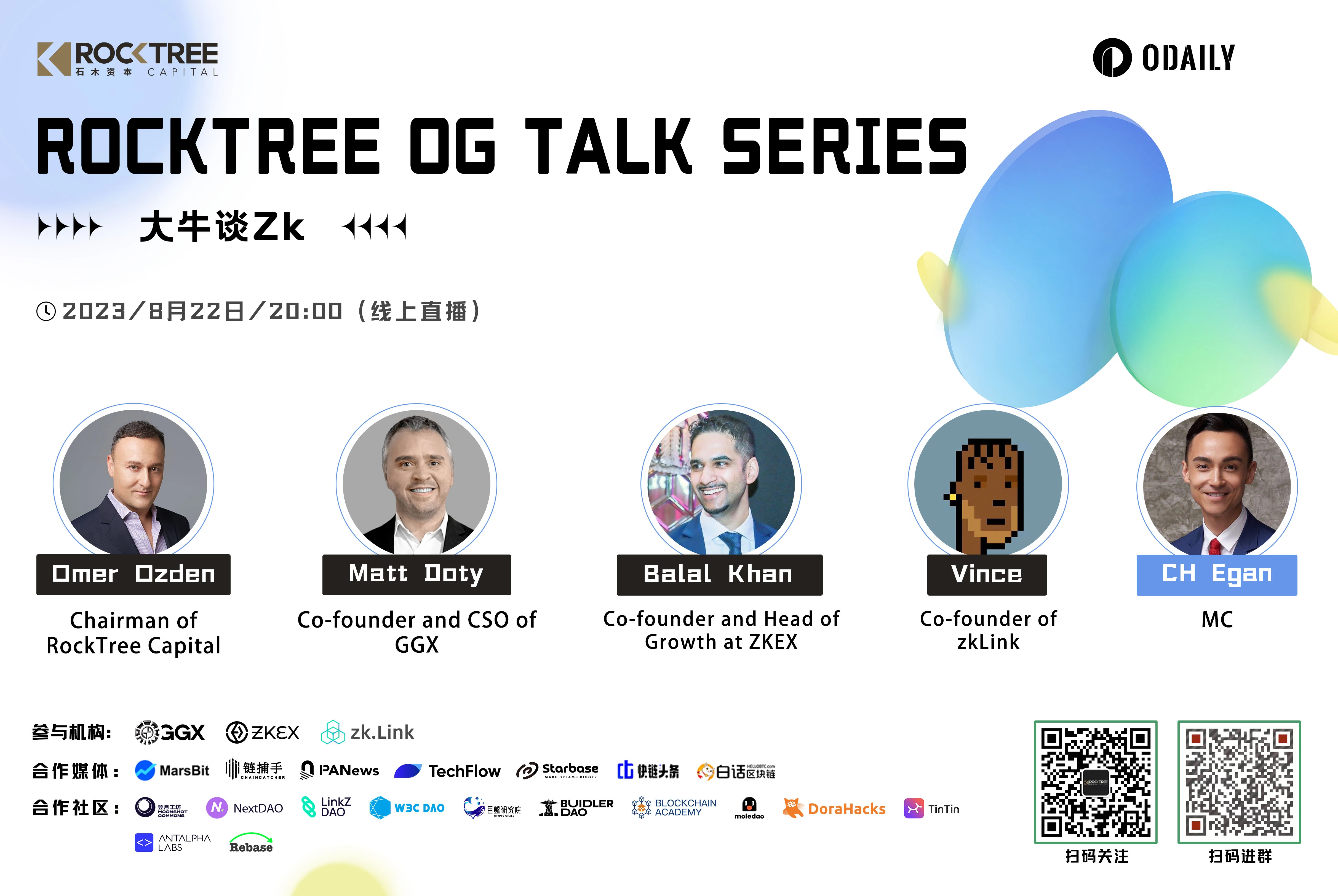 8 月 22 日 20 点,由 YouTube Influencer CH Egan 主持的本期圆桌会谈以《大牛谈 Zk》为主题展开讨论,四位嘉宾分别是:石木资本董事长兼真格基金国际合伙人 Omer Ozden 博士、 Golden Gate(GGX)联合创始人兼 CSO Matt Doty、ZKEX 联合创始人兼增长负责人 Balal Khan、 zkLink 联合创始人 Vince。