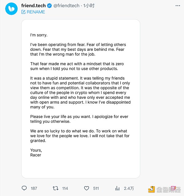 于是,在 friend.tech 发布第一条声明的5小时后,来自其创始人 Racer 的一封道歉信跟着发了出来: