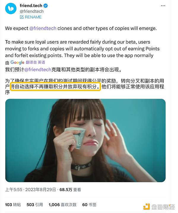 换言之,cobie 是在内涵 friend.tech 以经济利益来威胁用户,让他们在可能被取消空投积分的负面预期下,被迫不去使用其他仿盘,不薅其他项目羊毛。
