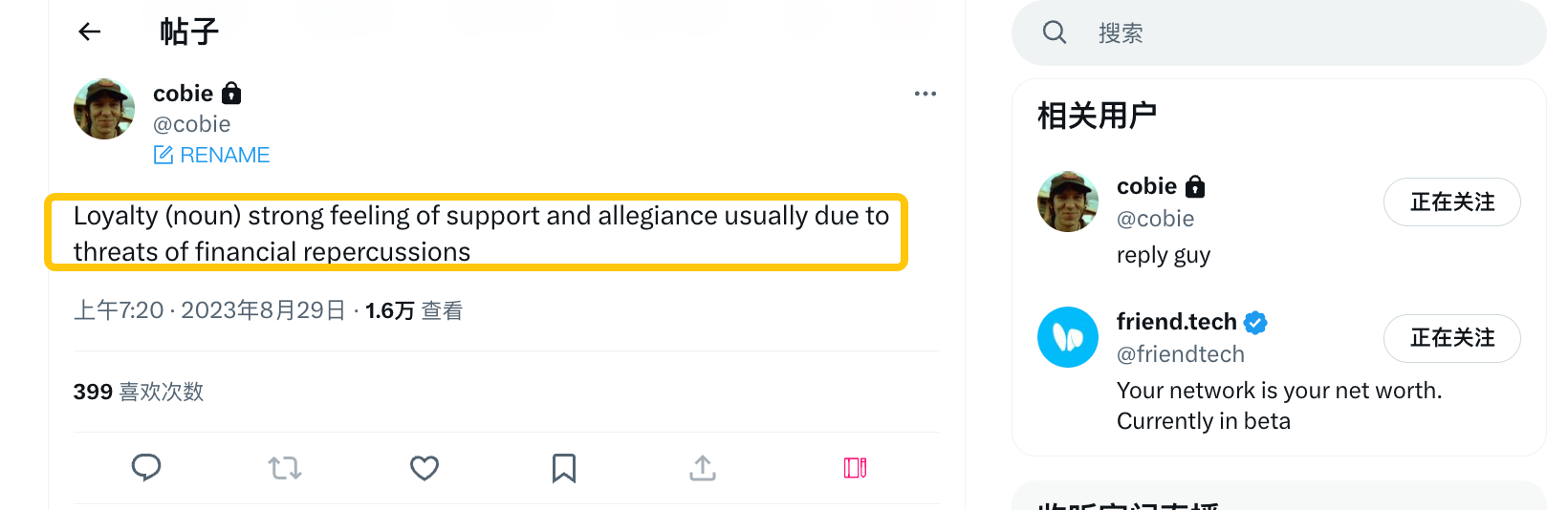 在 friend.tech 发布这份声明后,大佬 cobie 在评论区进行了幽默又精准的补刀,来了个名词解释: