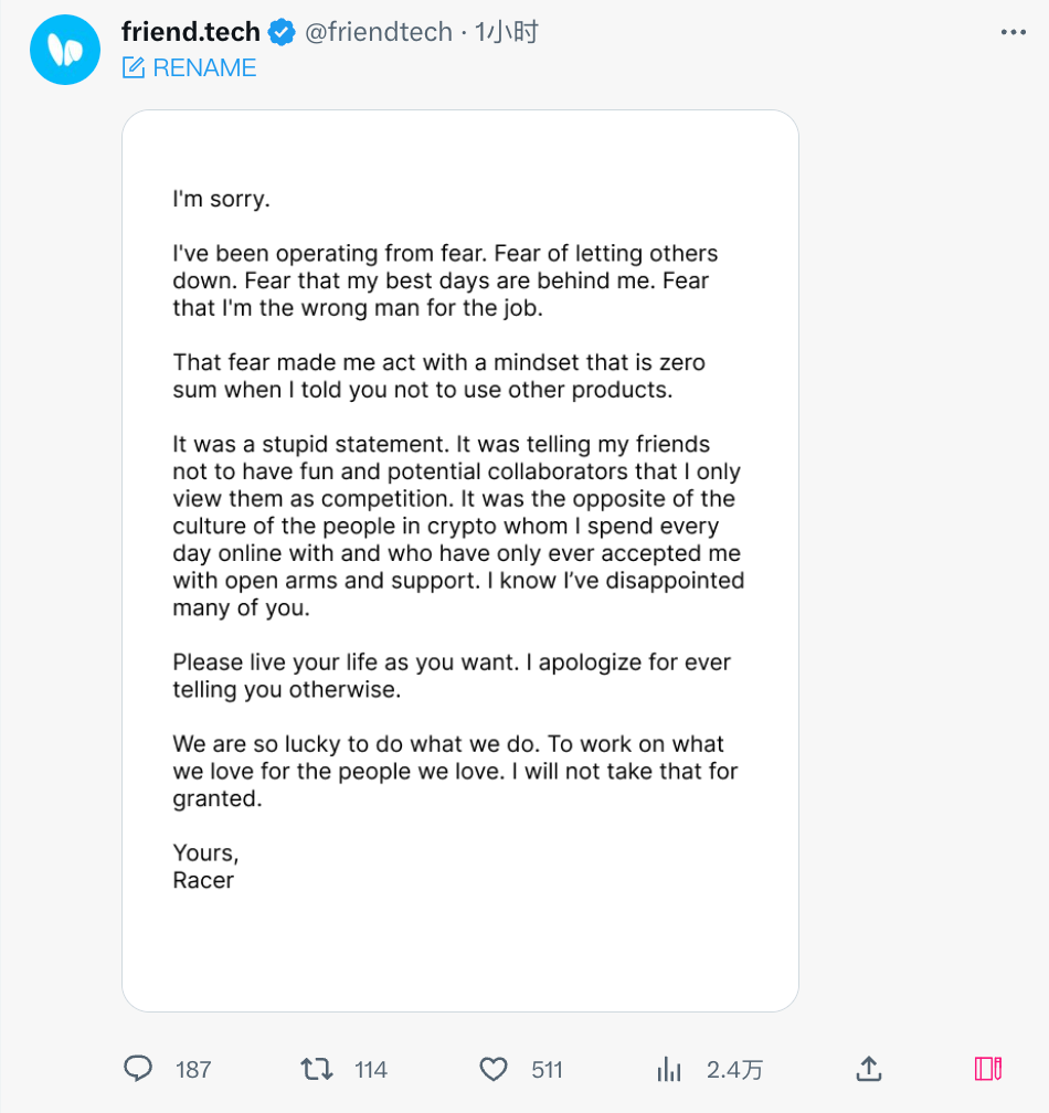 于是,在 friend.tech 发布第一条声明的 5 小时后,来自其创始人 Racer 的一封道歉信跟着发了出来: