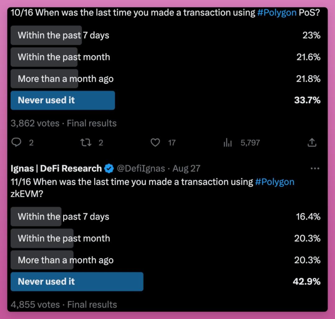 Polygon PoS 和 zkEVM 民意调查都比其他链多获得了 50% 的投票。