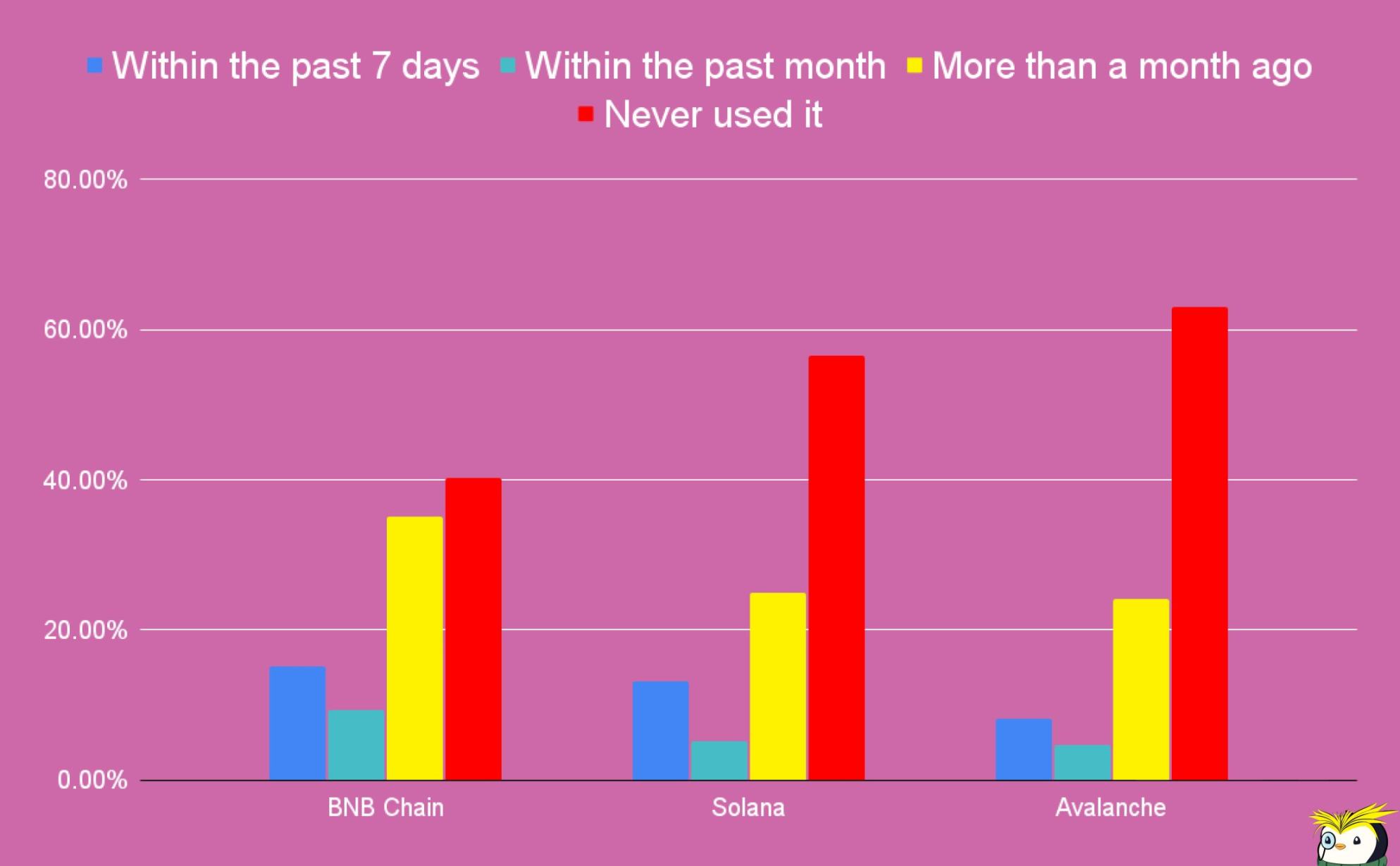 40% 的投票者从未使用过 BNB Chain,而 Solana ( 56% ) 和 Avalanche ( 63 %) 的这个比例更高。