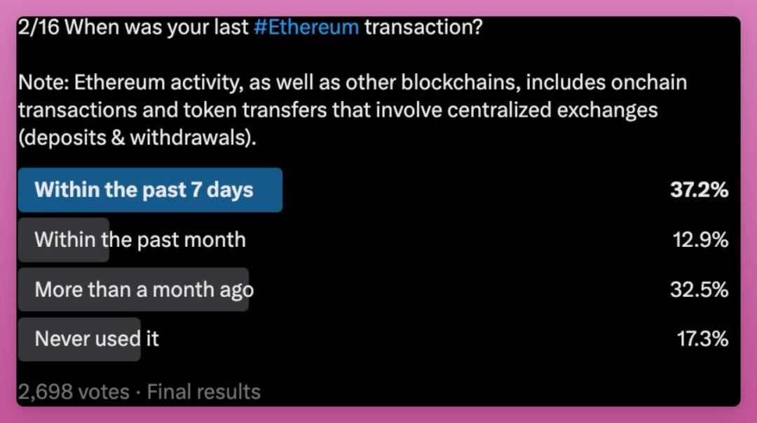 尽管市场看似平静,但 37% 的人在过去 7 天内在使用过以太坊主网。