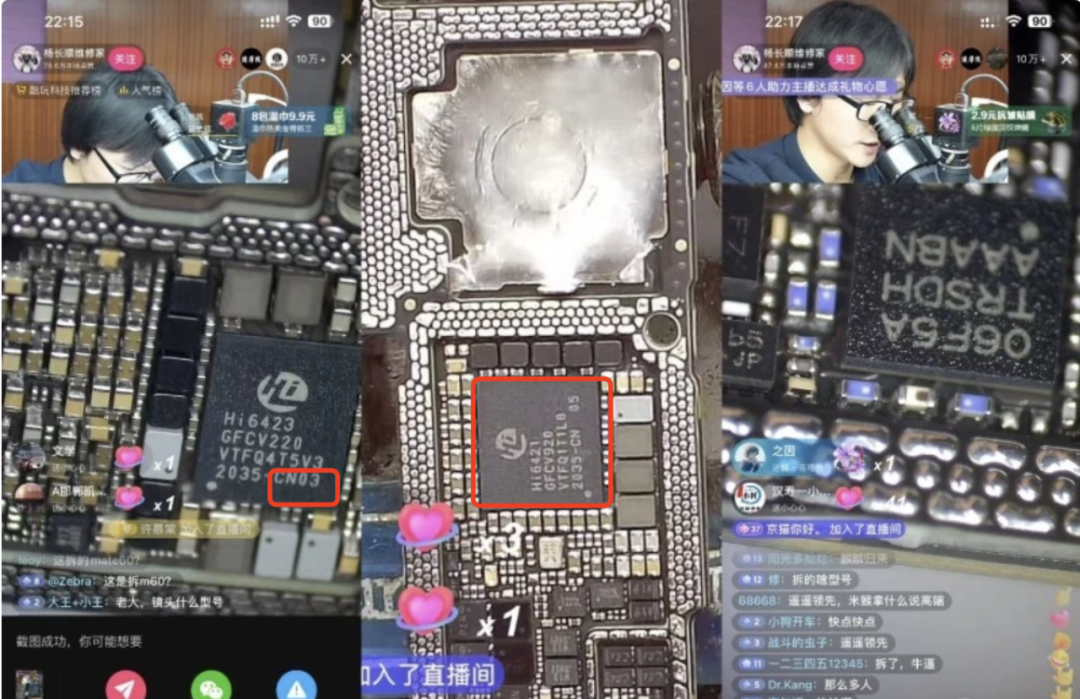 究竟是谁来代工这颗芯片?华强北第一时间出手,手机维修主播直播拆机,发现华为Mate 60 Pro的CPU上的编号是2035-CN,CN代表的产地是中国大陆,此前台积电代工的芯片是标注的是TW。