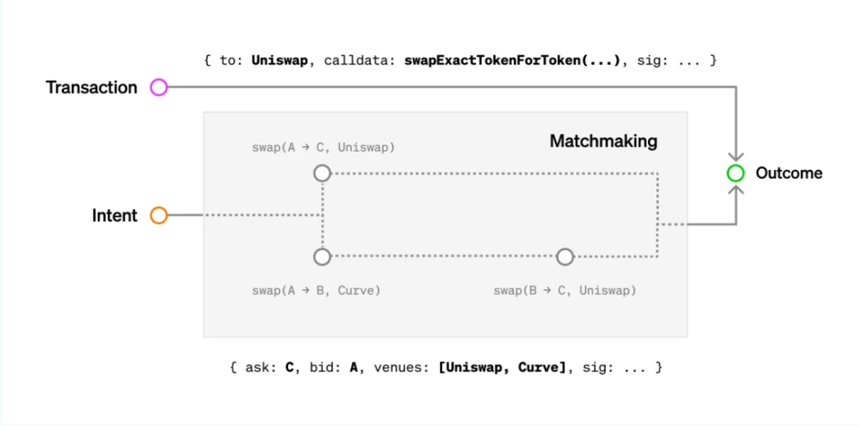 上图为例 ,用户通过 Uniswap 交易代币,想通过 Token A 换 Token B,用户只需要提供这一意图,至于过程中,是直接通过怎样的路径,使用具体哪家流动性池,用户都可以不用考虑,只要最终达成结果即可。