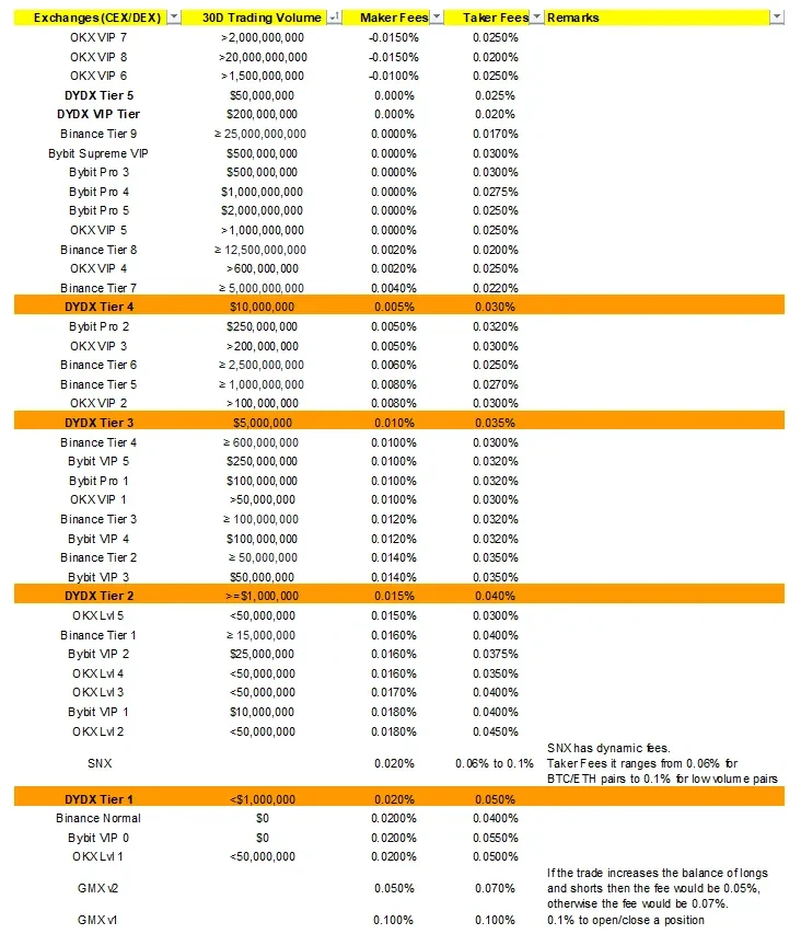 我们对 DYDX 的手续费与中心化交易所的比较表明,DYDX 的手续费已经具有竞争力,因此不受手续费压缩的影响。事实上,我们认为考虑到作为交易/流动性提供者奖励的 DYDX 代币,手续费可能被认为是较低的。