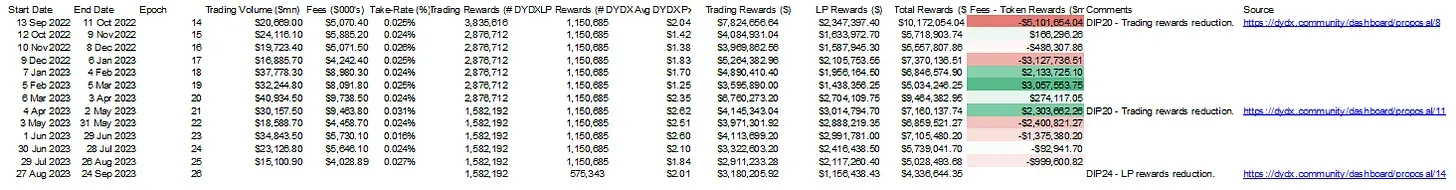 下表突出显示了 DYDX 净利润率(手续费减去发行量)今年的趋势,最新一个月达到了盈亏平衡。我们预计,在 DIP-24 中减少流动性提供者奖励后,它将再次趋向盈利状态。