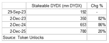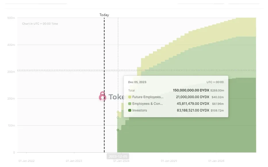 在 2023 年 12 月 1 日解锁的 1.5 亿 DYDX 代币中,有 30% 属于“员工和顾问”。我们已经看到了这种情况的先例,因为之前的解锁已经推迟,以更好地与延迟的 v4 的时间同步;很可能是为了确保代币供应与价值累积后的需求之间有良好的交集。