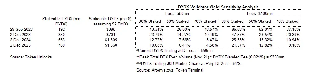 根据当前的 DYDX 手续费(5000 万美元 ——过去 30 天手续费年化),我们估计从第一天开始,验证者的质押收益率将最低达到 15% (假设所有流通的 DYDX 都被质押),但更可能接近 20% (假设质押的代币比例与其他高手续费增长代币(如 SNX、