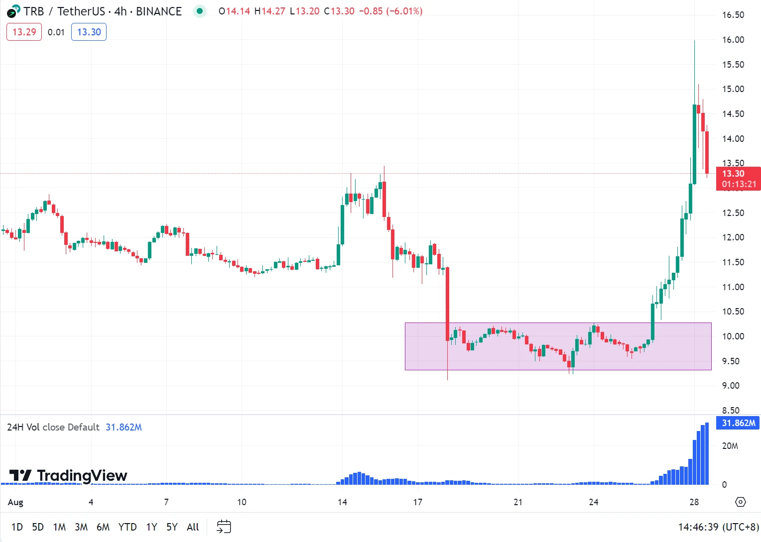 作者观察跟踪了 TRB( Tellor Tributes,提供预言机服务)短期资金面情况,尝试寻找上涨启动之前的一些信号;再了解基本面情况,主要看是否存在利好或者利空。从 8 月 25 日至 8 月 28 日凌晨,TRB 代币价格从 9.6 美元上涨最高至 16 美元,涨幅接近 66% ,之后进入回调。