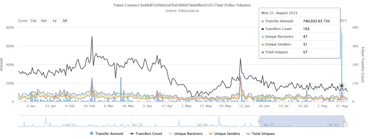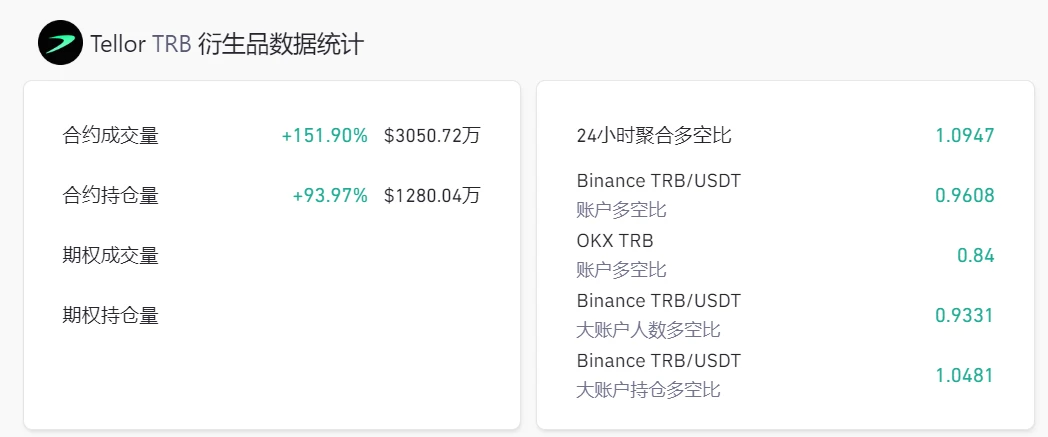接下来的两天,TRB 的合约成交量和持仓量都出现了极大幅度的增长。最近 24 小时,其合约交易量为 16 亿美元,持仓量约为 6800 万美元。