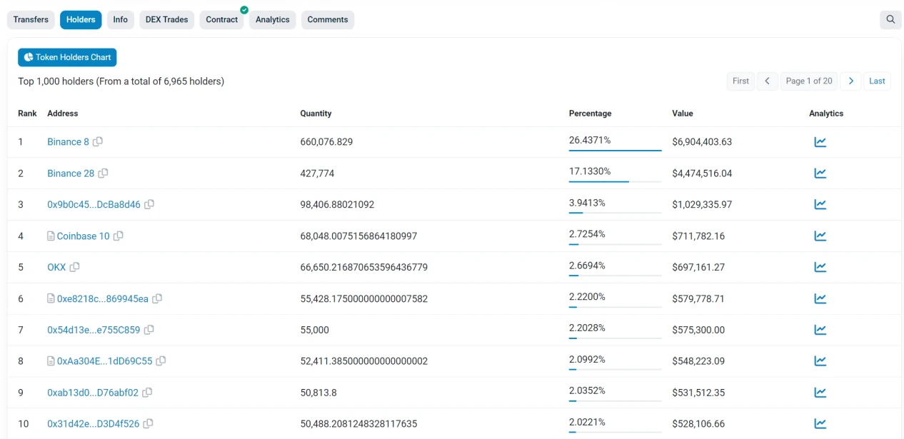 8 月 26 日的前十名持仓情况如下,币安持有超过 43% 的代币,代币集中程度较高。