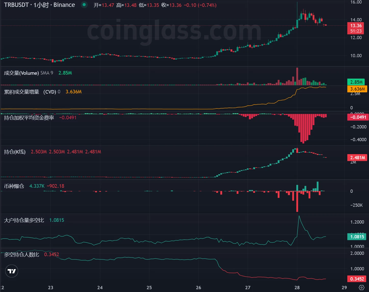 Tellor Tributes(TRB)短期价格上涨主要由资金驱动。当 8 月 28 日凌晨冲高后,持仓量下跌,价格也出现明显回落。
